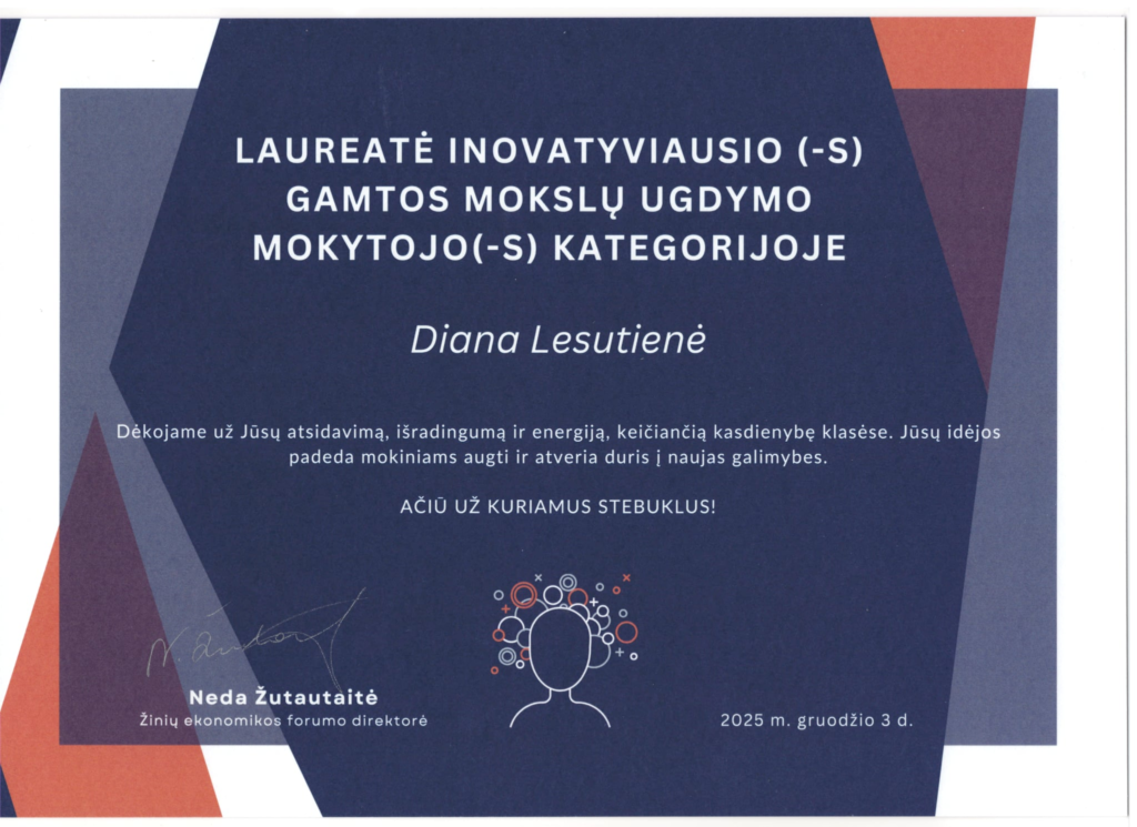 Iš daugiau nei 120 kandidatų visoje šalyje buvo atrinkti tik 15 pedagogų, įvertintų už inovatyvų ugdymą, kūrybiškus sprendimus ir šiuolaikiškus mokymo metodus. Didžiuojamės, kad tarp jų – ir mūsų mokytoja Diana, stiprinanti STEAM bei gamtos mokslų kryptį mūsų bendruomenėje.